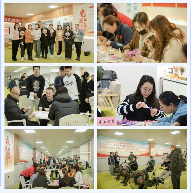 据悉,学院以迎接第114个“三八”国际妇女节为契机,通过党工共建、支部联建的形式策划开展了“执扇芳华、共享文化—热辣滚烫·致敬闪闪发光的“她”;方寸之间、感受“棋”妙—热辣滚烫·悦生活;悦运动、享健康—热辣滚烫·爱自己”系列活动。团扇DIY区老师们正在专心体验非遗文化,在花与叶之间体验自然古风之美。棋牌交流区有象棋、跳棋、掼蛋和斗地主,老师们时而低头沉思,时而浅笑不语,沉着冷静,缜密思考,其乐融融。而在力量健身区,老师们利用坐姿推胸器、蝴蝶机、高位下拉机等器械开展15秒重量数量挑战,让人当“燃”不让,活力无限。